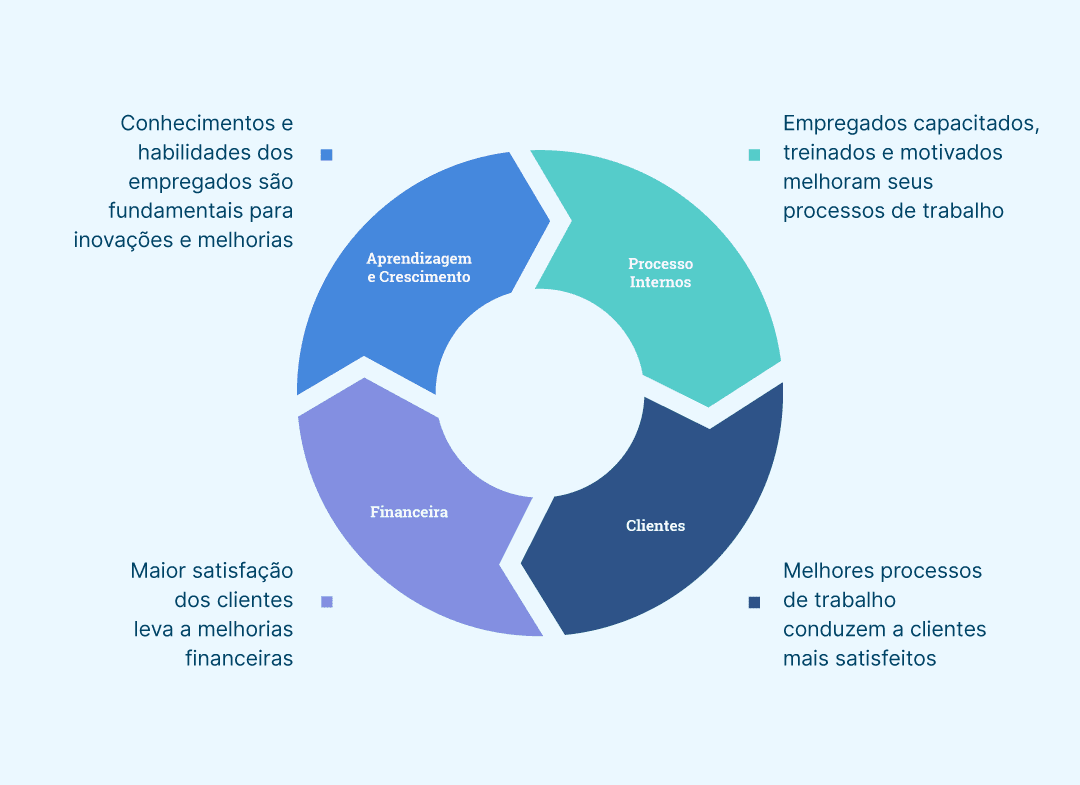 - Aprendizado e Crescimento: Como a organização deve aprender e inovar para atingir nossas metas? O foco em melhorias específicas de processos existentes deve entrar no planejamento visto que o mercado e a concorrência exigem que a empresa se reinvente em tempos, com produtos novos e processos eficientes.